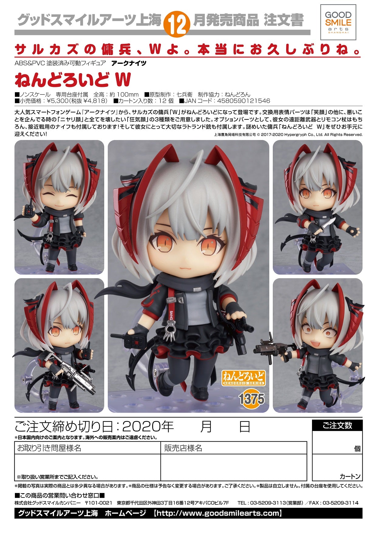 From the popular smartphone game "Arknights" comes a Nendoroid of W, mercenary of the Sarkaz race! She comes with three face plates including a smiling expression, a grinning expression and a crazed expression.